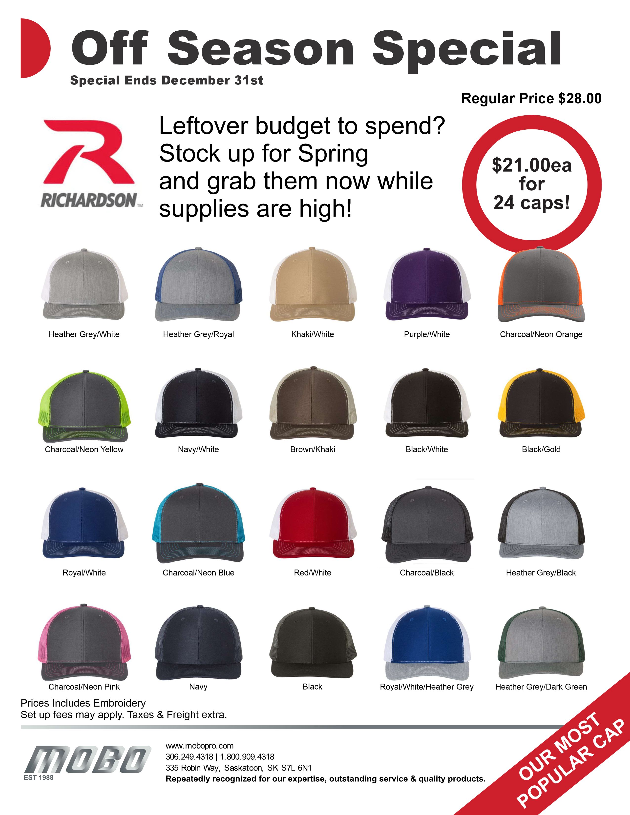 On a personal note, THANK YOU for your support throughout 2024. We cannot thank you enough! What we can do though is offer you an incredible special on the caps you love the most...the Richardson 112. You can save $168.00 on 24 decorated caps if you order by the end of December! See the flyer below for more info.