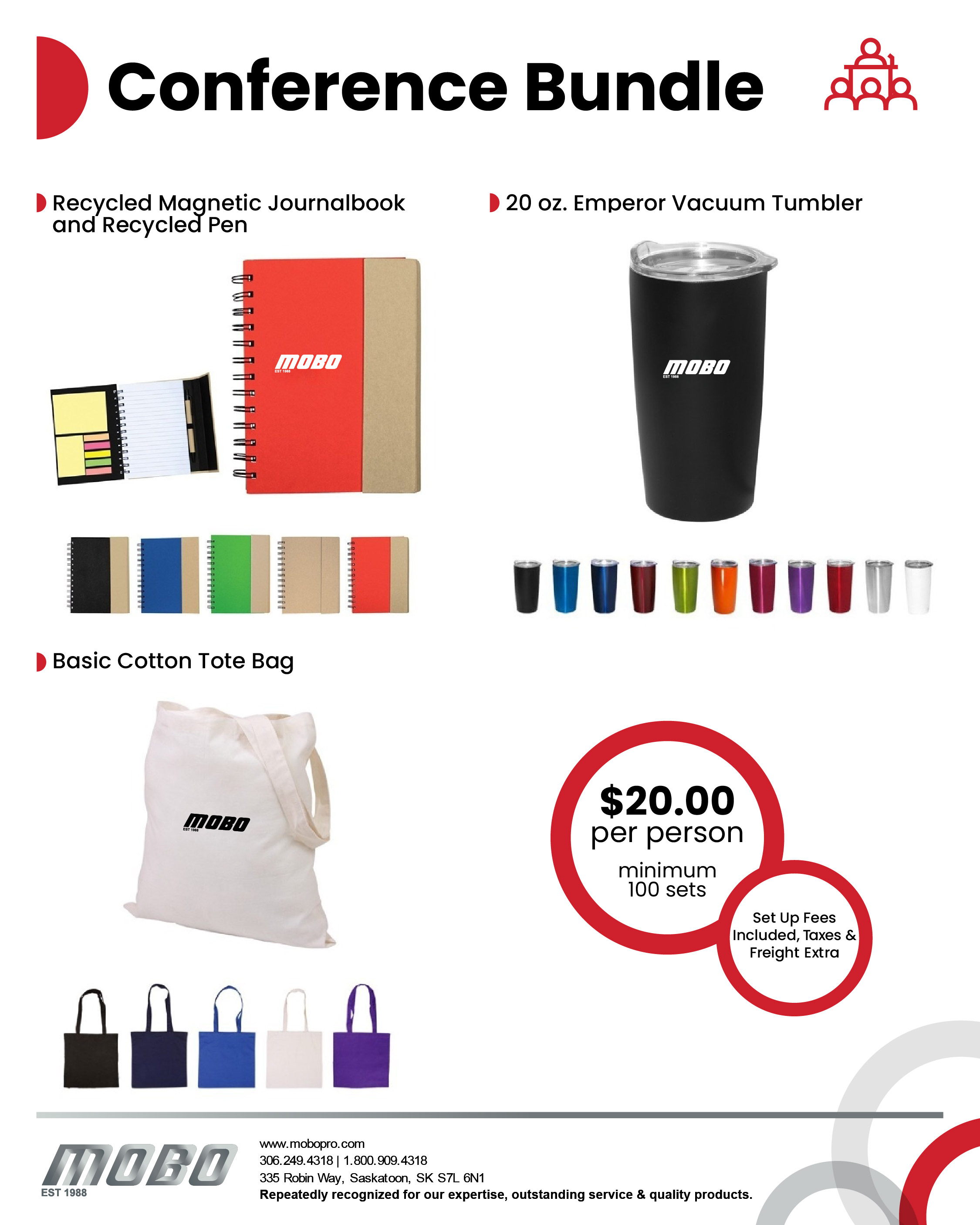 If you are responsible for planning a conference with 100+ attendees, then our Conference Bundle will be of utmost interest to you! At just $20/person, you can provide attendees with a journal, pen, tumbler and cotton tote bag. Exceptional value and so easy to order!