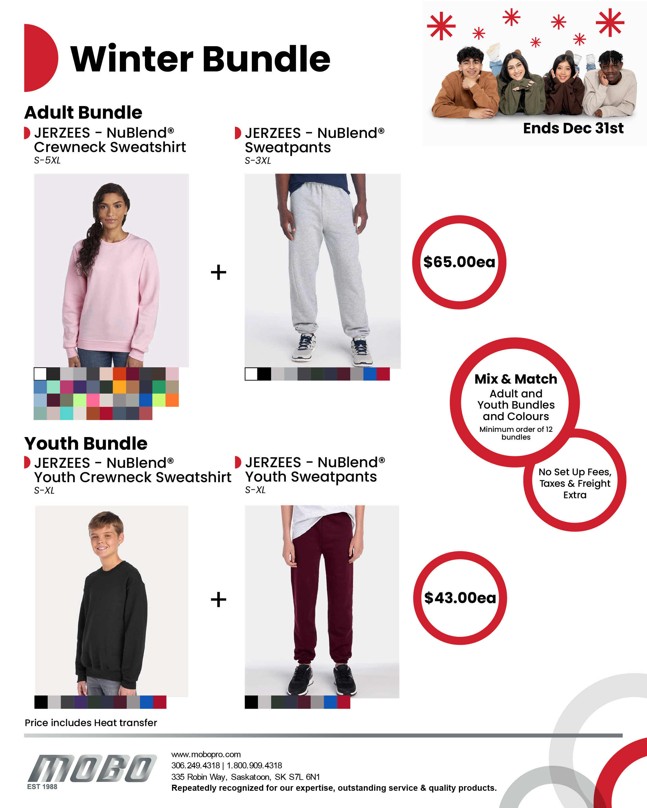 As we roll into winter, it is time for us to launch our Winter Bundle! This year we are going with a combo of a crewneck sweatshirt and sweatpants in both Adult and Youth. With just a 12-set minimum, this can be the perfect cozy family wear for Christmas instead of pajamas! Be sure to check out the details below for more info.